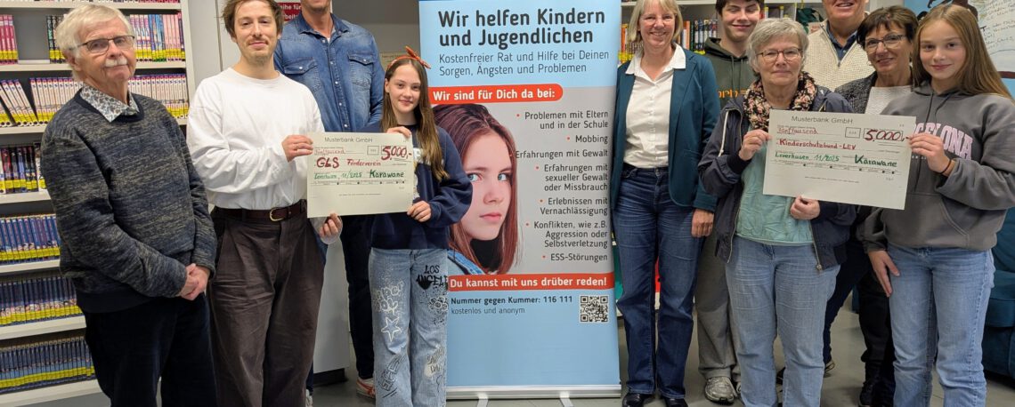 Zur Spendenübergabe kamen stellvertretend u.a. drei Teilnehmer:innen der Karawane. Sophie Hebbel, Lennart Maus und Finja Mentzel überreichten die beiden Schecks über je 5000,- Euro. So freute sich auch unser ehemaliger Schulleiter Bruno Bermes, der hier in seiner Funktion als Vorsitzender des Kinderschutzbundes erschienen ist.